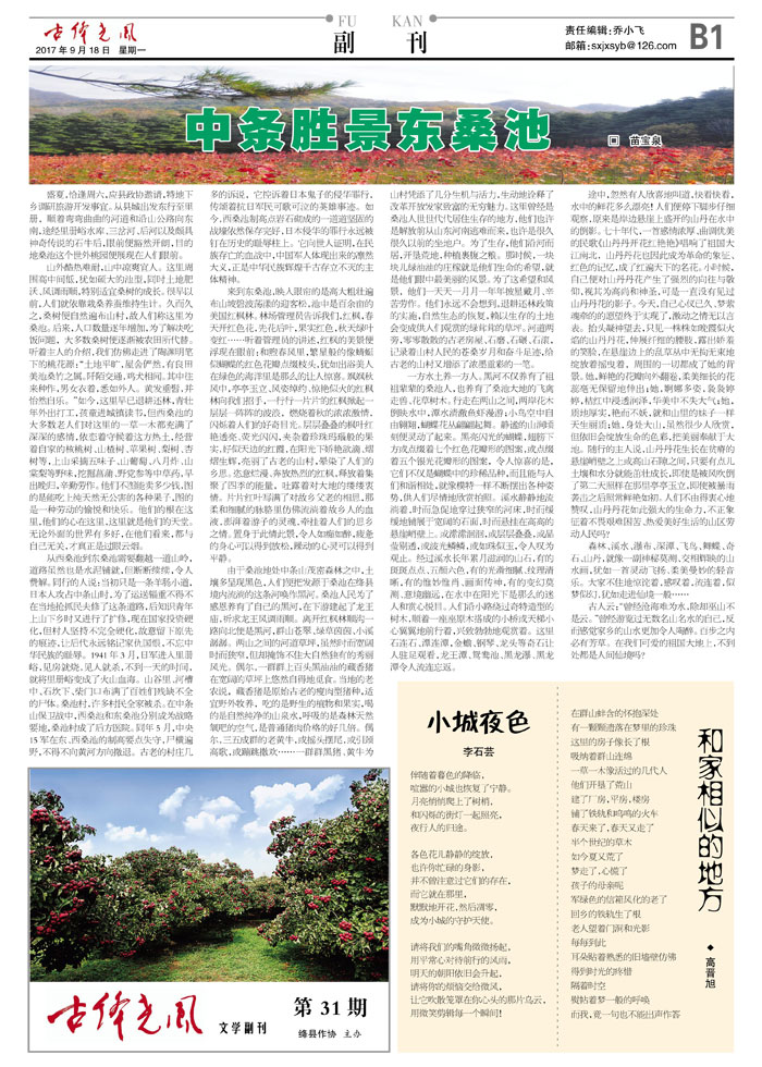 盛夏,恰逢周六,应县政协邀请,特地下乡调研旅游开发事宜。从县城出发东行至里册,顺着弯弯曲曲的河道和沿山公路向东南,途经里册峪水库、三岔河、后河以及颇具神奇传说的石牛后,眼前便豁然开朗,目的地桑池这个世外桃园便展现在人们眼前。