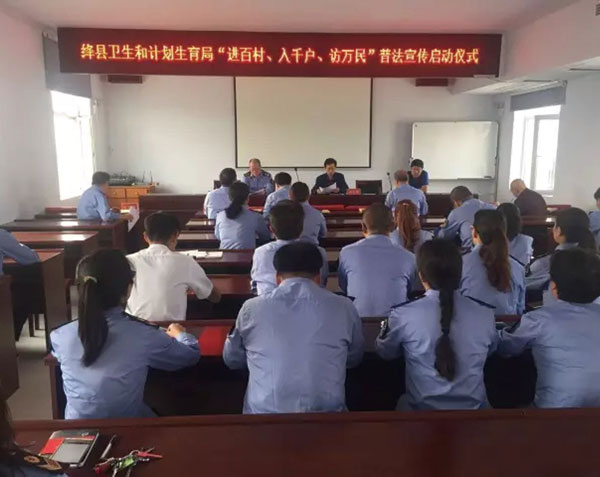 本报讯 为认真贯彻落实党的十八大、十八届三中、四中、五中、六中全会精神以及习近平总书记系列重要讲话,迎接党的十九大顺利召开,深入推进卫生计生法律法规普法工作全面实施,开创卫生计生系统普法工作新局面,根据中共中央办公厅、国务院办公厅《关于实行国家机关"谁执法谁普法"普法责任制的意见》要求,9月18日,县卫计局在卫生监督所三楼会议室召开了"绛县卫生和计划生育局普法宣传进百村、入千户、访万民"启动会。会议由政策法规股股长杨珍珠主持,分管副局长逯矿旗、政策法规股和监督所全体干部职工参加了会议。