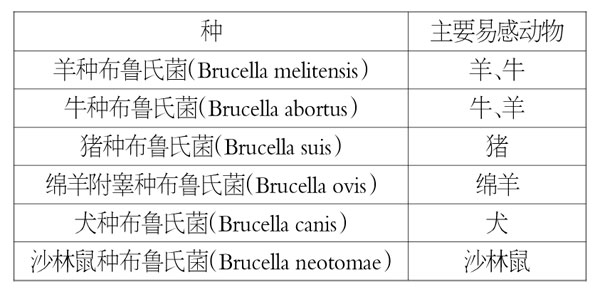 布鲁氏菌属的6个种和主要易感动物见下表: