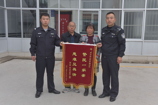 本报讯 10月22日,郝庄乡南庄村董正权全家在鞭炮声中将一封感谢信和一面书写着“警民一家亲、患难见真情”的锦旗送到横水派出所。