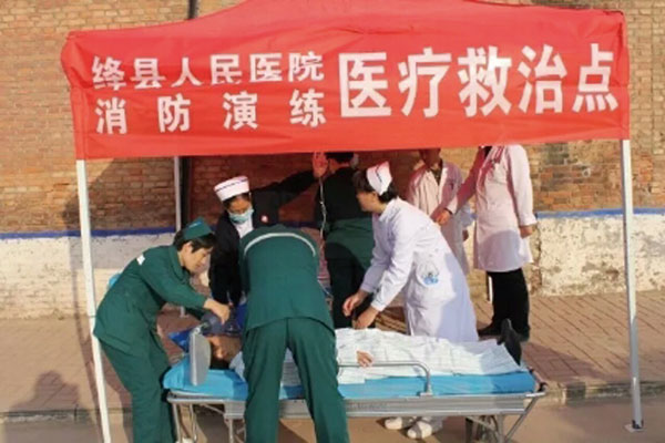 演练模拟县医院住院大楼一病房因手机充电器短路引燃窗帘,导致火灾。值班人员发现后,立即向保卫科及医院消防应急队上报。接报后,保卫科及医院消防应急队员立即行动,赶赴现场,用灭火器对火势进行控制。医务人员迅速组织病人及家属按照指定路线撤离。救护组人员将受伤人员扶上担架送往救治点。短短十几分钟,疏散、救护、灭火工作顺利完成。