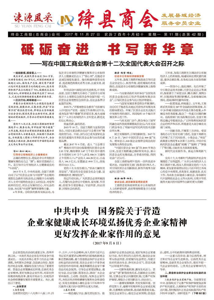全面贯彻党的十八大和十八届三中、四中、五中、六中全会精神,深入贯彻习近平总书记系列重要讲话精神和治国理政新理念新思想新战略,着力营造依法保护企业家合法权益的法治环境、促进企业家公平竞争诚信经营的市场环境、尊重和激励企业家干事创业的社会氛围,引导企业家爱国敬业、遵纪守法、创业创新、服务社会,调动广大企业家积极性、主动性、创造性,发挥企业家作用,为促进经济持续健康发展和社会和谐稳定、实现全面建成小康社会奋斗目标和中华民族伟大复兴的中国梦作出更大贡献。