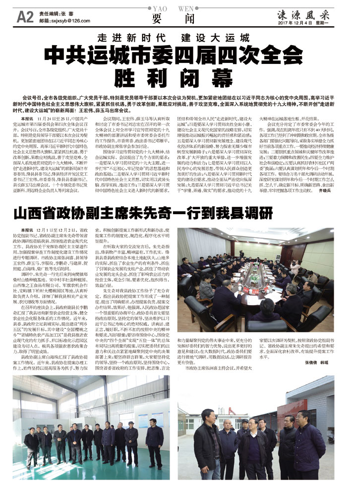 本报讯 12月1日至12月2日,省政协党组副书记、省政协副主席朱先奇带领省政协调研组莅临我县,围绕推进农业现代化工作、县政协关于发挥协商民主主渠道作用,加强提案审查工作制度化建设工作情况进行专题调研。市政协主席张润喜、县领导王宏伟、薛玉马、李服役、李鹏奇、马建萍、贺照庭、白海珠、柴广胜等先后陪同。