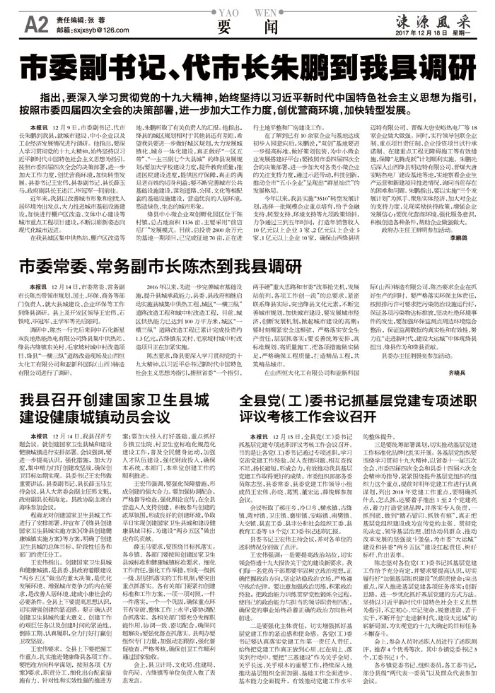 本报讯 12月9日,市委副书记、代市长朱鹏到我县,就城市建设、中小企业以及工业经济发展情况进行调研。他指出,要深入学习贯彻党的十九大精神,始终坚持以习近平新时代中国特色社会主义思想为指引,按照市委四届四次全会的决策部署,进一步加大工作力度,创优营商环境,加快转型发展。县委书记王宏伟,县委副书记、县长薛玉马,政府副县长王述江、毕冠军一同前往。