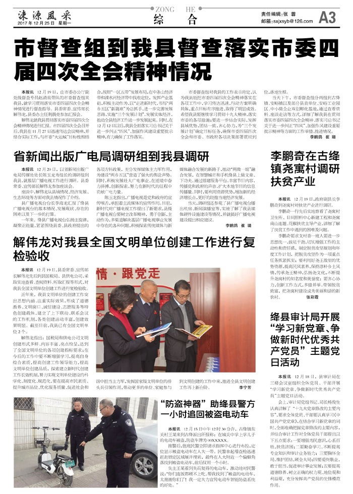 当天下午,市委督查组分两组到古绛镇、安峪镇以及部分县直单位、安峪工业园区、中小微企业双创孵化基地,通过查看资料、座谈走访等方式,详细了解我县在贯彻落实市委四届四次全会精神、落实习总书记关于进一步纠正“四风”、加强作风建设重要批示精神等方面的工作举措、推进情况。