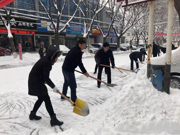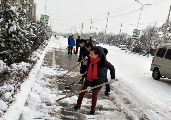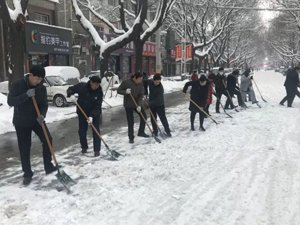 在各路段,大家不畏严寒,分工明确,团结协作,有的挥舞铁锨,铲冰除雪,有的手拿扫帚,清扫路面,经过两个多小时的辛勤劳动,街道上的积雪得到有效清除,为广大群众的生活与安全出行带来了便捷。