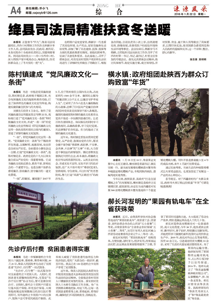 本报讯 1月15日至18日,绛县果业发展中心主任王建设,横水镇党委副书记、镇长宋刚一行,就当地发展矮化樱桃苗木繁育和种植温室矮化樱桃产业,专程到陕西阎良、澄城两地实地考察。