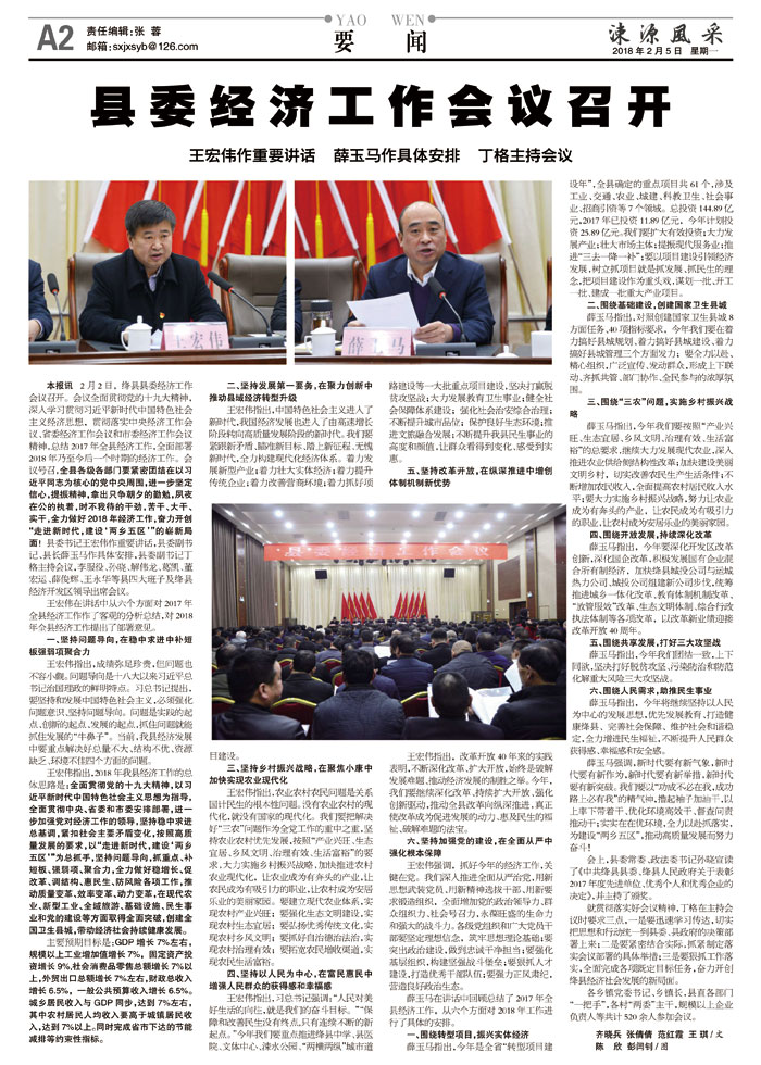 薛玉马在讲话中回顾总结了2017年全县经济工作,从六个方面对2018年工作进行了具体的安排。