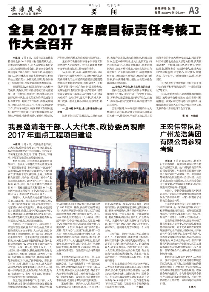 本报讯 2月1日,我县邀请老干部、人大代表、政协委员对2017年全县重点工程项目建设情况进行实地观摩,县四大班子领导王宏伟、薛玉马、丁格、李服役、李晓燕、毕冠军等先后参加观摩或座谈。