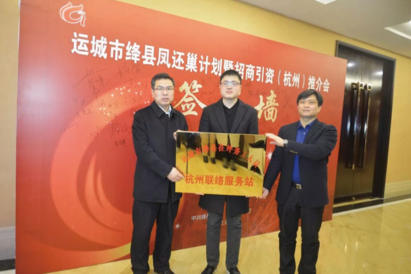 会上,运城市绛县关心关爱在外人员服务中心为杭州联络服务站授牌,绛县人民政府与浙江方成机电有限公司、江南纺织有限公司、中科院苏州地理信息与文化科技产业基地等8家企业签订了投资合作协议,投资总额21.8亿元。