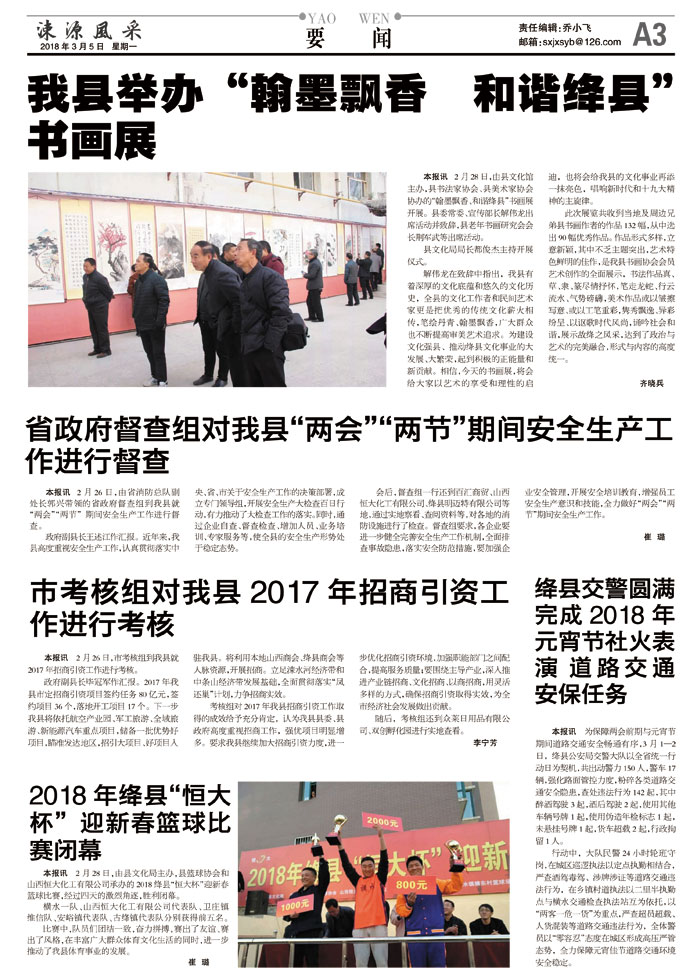 本报讯 2月26日,由省消防总队副处长郭兴带领的省政府督查组到我县就"两会""两节"期间安全生产工作进行督查。