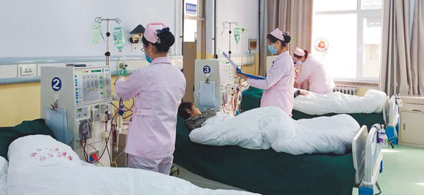 血液净化室的护士们在给患者安装管路上机、核对医嘱、引血上机。