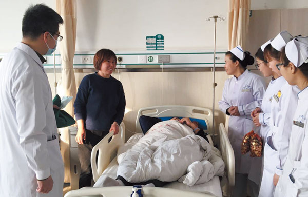 神经外科医护人员进行业务查房并给住院患者带来了自己科室准备的新年小礼物,使患者家属倍感温暖。