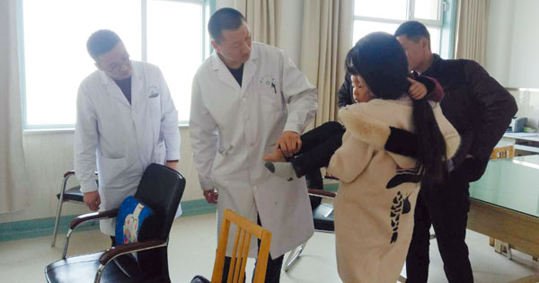 骨科许大夫正在为一名脚部扭伤的小孩做检查,骨科护士们带着自己准备的春节小慰问品送到每位患者的手中。