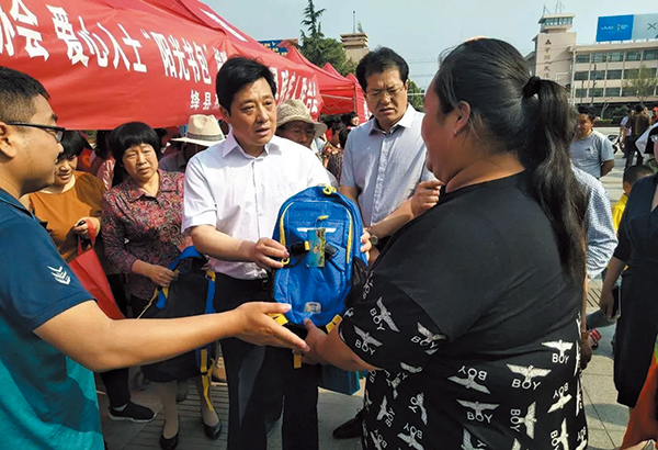 本报讯 在第28个全国助残日来临之际,5月16日,县残联在电影院广场组织开展了以"全面建成小康社会,残疾人一个也不能少"为主题的助残日活动。县委常委、统战部部长董宏运,县人大常委会副主任李晓燕、政府副县长毕冠军、县政协副主席柴广胜等参加活动,并为中国盲协低视力持证儿童捐赠了"阳光书包"。