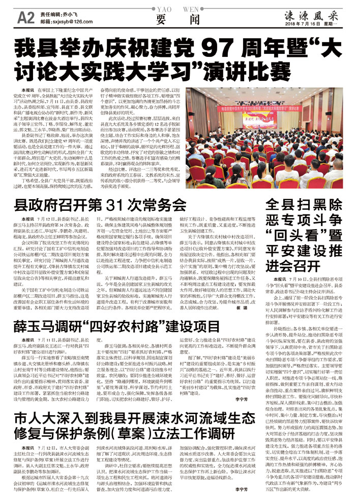 本报讯 在举国上下隆重纪念中国共产党成立97周年,全县掀起“大讨论大实践大学习”活动热潮之际,7月11日,由县委、县政府主办,县委组织部、宣传部、县直工委、县文联和县广播电视台协办的“新时代、新作为、新风采”主题演讲比赛在波音大酒店举行,县四大班子领导王宏伟、丁格、李服役、解伟龙、董宏运、郭文魁、王永华、李晓燕、柴广胜出席活动。