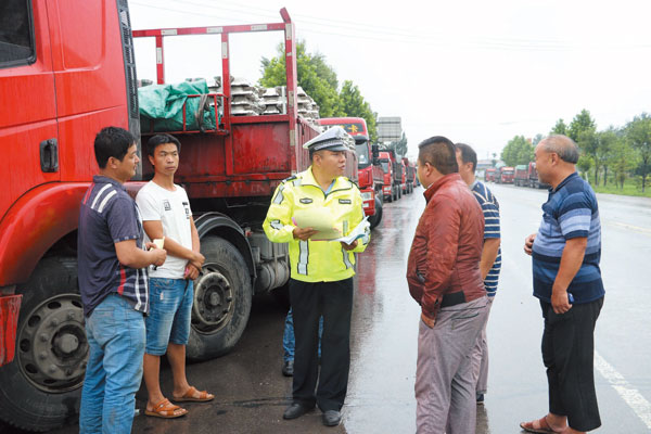 在国道连固线与横水高速引道交叉口,因连续的降雨垣孙高速临时关闭了大车通行,致使数十辆大型货车滞留该路段,该大队横水中队民警站在雨中指挥一辆辆大型货车有序停放在路边不妨碍交通的位置,放置好隔离锥筒进行警示,并积极对驾乘人员沟通引导。宣传民警还利用驾驶人停车休息间隙,向广大驾驶人宣传雨天、汛期交通安全行车常识及注意事项,让大车驾驶人在等待期间接受了交通安全教育。