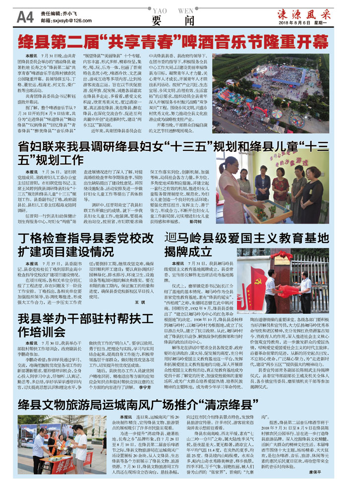 为进一步提升“清凉绛县、避暑胜地、长寿之乡”品牌形象,自7月28日至8月10日,在绛县第二届音乐啤酒节之际,绛县文物旅游局在运城南风广场设置展板20余块,从人文绛县、生态绛县等各个方面展示了绛县文物、旅游资源。7月30日,绛县文物旅游局工作人员还在现场设立咨询台,悬挂条幅,向过往市民介绍绛县景点特色,发放绛县旅游宣传册。许多市民、游客前来咨询并表示想前往看看。
