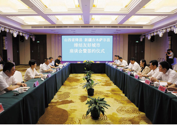 吉木萨尔县委书记李刚在讲话中说,从历史文化上来看,吉木萨尔境内有1500年历史的世界文化遗产北庭故城、2000多年历史的中国十大古道车师古道、佛教北极千佛寺等各级文化遗址110处。而绛县更是有尧王故里、晋国古都、倗国领地、绛侯封邑、“天下第一县”之美誉。两县均是千年古县,历史悠久、文化厚重。从产业上来看,两县互补合作的空间非常广阔。两县都是传统农业县,都在积极发展旅游产业。以上这些都为双方的合作打下了坚实的基础。合作共赢,行稳致远。此次两县缔结为友好城市,就是互相发展,共同进步的良好开端。山西绛县、新疆吉木萨尔,千里相隔,却隔不断两地加快发展的共同愿望。我们坚信,有两地党委、政府的正确领导和人民的共同努力,必将谱写出两地转型发展新篇章!