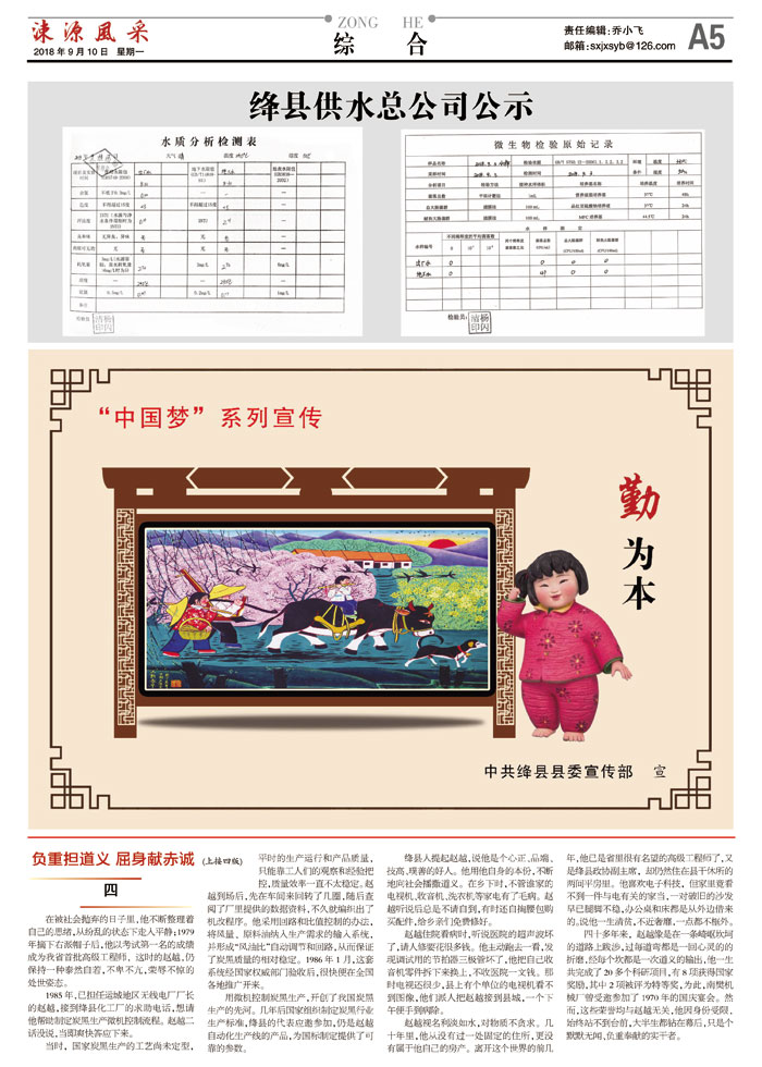 绛县人提起赵越,说他是个心正、品端、技高、璞善的好人。他用他自身的本份,不断地向社会播撒道义。在乡下时,不管谁家的电视机、收音机、洗衣机等家电有了毛病。赵越听说后总是不请自到,有时还自掏腰包购买配件,给乡亲们免费修好。