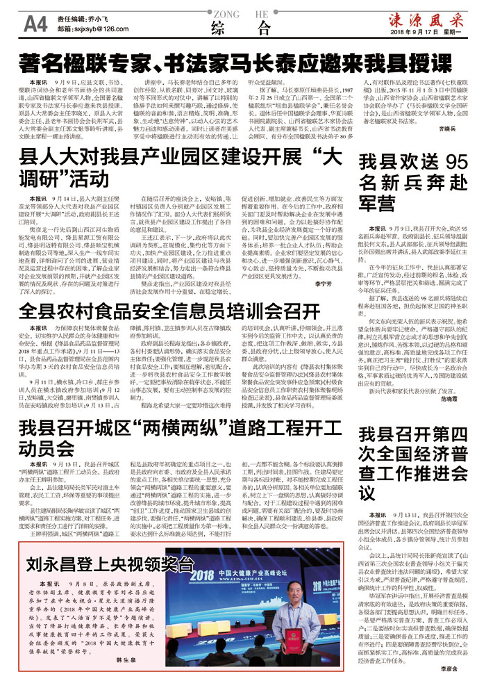 本报讯 9月9日,应县文联、书协、樱联诗词协会和老年书画协会的共同邀请,山西省楹联文学领军人物、全国著名楹联专家及书法家马长泰应邀来我县授课。原县人大常委会主任李晓光,原县人大常委会主任、县老年书画协会会长荆军武,县人大常委会副主任郭文魁等聆听讲座,县文联主席程一娜主持讲座。