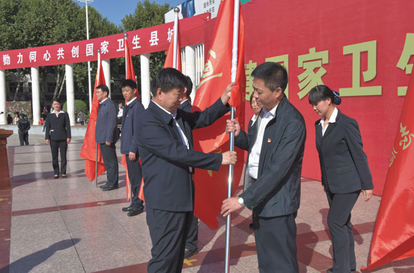 县委书记王宏伟为绛县创卫先锋队、突击队、奋进队、宣传队和青年志愿者代表进行了授旗。