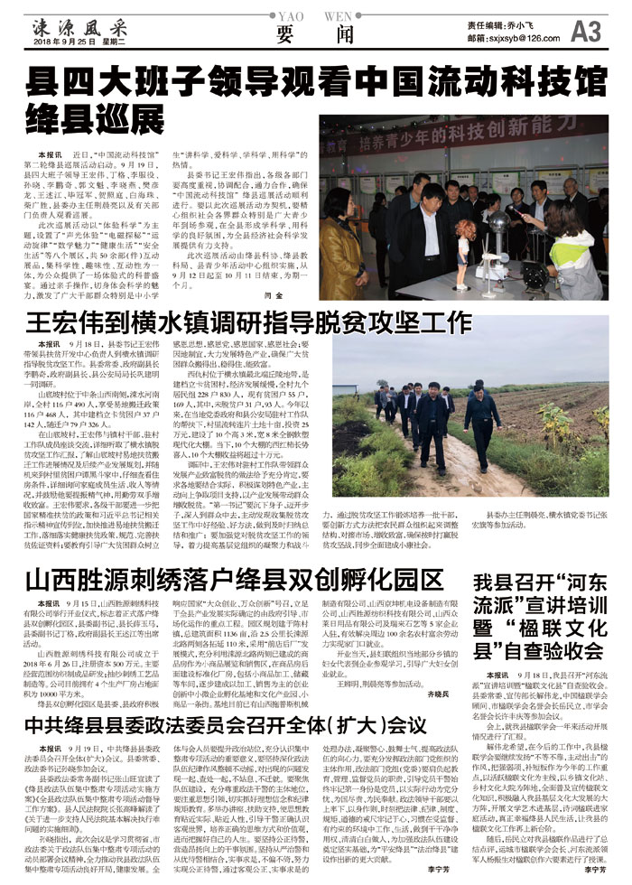 本报讯 近日,“中国流动科技馆”第二轮绛县巡展活动启动。9月19日,县四大班子领导王宏伟、丁格、李服役、孙晓、李鹏奇、郭文魁、李晓燕、樊彦龙、王述江、毕冠军、贺照庭、白海珠、柴广胜,县委办主任荆晨亮以及有关部门负责人观看巡展。