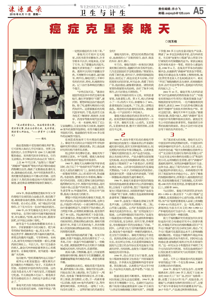 上世80年代以来,“血服生口服液”“消瘤神”“癌痛消”等纯中药系列防治癌症药物横空出世,挽救了无数癌症患者的生命,堪称癌症的克星,为中华民族和世界人类的繁荣昌盛做出不可磨灭的贡献。这些造福于人类的防治癌症纯中药制剂的研制者,就是绛县南樊镇郑柴农民秦晓天。