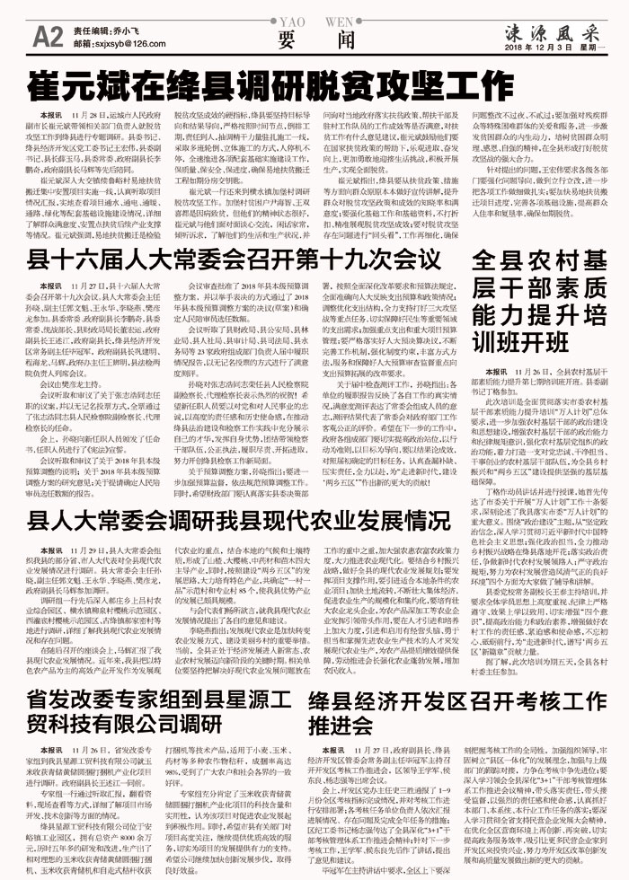 本报讯 11月28日,运城市人民政府副市长崔元斌带领相关部门负责人就脱贫攻坚工作到绛县进行专题调研。县委书记、绛县经济开发区党工委书记王宏伟,县委副书记、县长薛玉马,县委常委、政府副县长李鹏奇,政府副县长马辉等先后陪同。