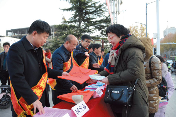 本报讯 12月4日是第五个“12·4”国家宪法日,当天,全县70余家行政执法单位在电影院广场设立宣传咨询台,向过住群众发放宣传资料,接受群众咨询。县四大班子领导王宏伟、薛玉马、孙晓、李服役、解伟龙、郭文魁、巩建明、县法检两长等出席活动。