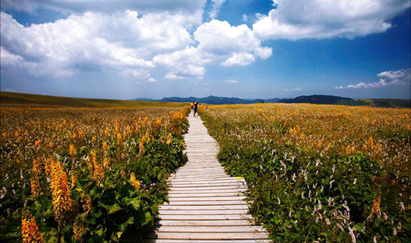 初秋的舜王坪草色己有些枯萎,各色的花朵,如散落的星辰点缀其间,更衬托出了它的辽阔苍茫。四面八方延伸的木栈道,取代了原有的镂空砖石小道。行走在半米高的木栈道上,环视四周,蓝天为幕,朵朵白云,随风曼舞。俯瞰茫茫草原,视野开阔的再无一物可阻挡,让人大有行走天街之感。舜帝庙依旧在那处小山坳里,静静的守候着这一方圣地。连理枝粗壮了许多,望月台、奶泉、老虎口,散布在坪上,正用它们迷人的传说或独特的魅力吸引着游人的目光。乌鸦的啼叫,一如当年清亮,我知道,这决不是当年我看到的那几只,但一定是他们的后代,在舜王坪上,它们具有了超脱俗世的神性!