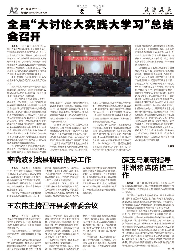 四、落实“做”这个根本,在推进发展上持续用力。王宏伟指出,推动高质量发展,是我们开展活动的根本目的,也是检验活动成功与否的主要标准。要对照县委年初的安排部署,全力冲刺项目建设、脱贫攻坚、重点工作承诺、农村人居环境卫生整治等重点工作,一件一件下功夫,一项一项抓落实,推动县委重大决策部署在本乡镇、本部门、本系统得到不折不扣地贯彻执行,确保全年各项目标任务圆满完成,以优异成绩向县委和全县人民交上一份满意答卷。同时,各级各部门还要提前谋划好2019年工作大盘子,及早动手、及早谋划、及早部署,抢抓机遇,抢前抓早,为绛县的发展争取更大动力,推进经济社会各项事业再上新台阶、取得新成就、实现新辉煌!