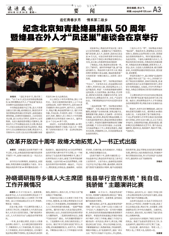三是尽心尽力“带”,当好绛县未来的“推动者”。绛县的未来,需要绛县人民的共同努力,需要社会各界的鼎力支持,更需要各位前辈的积极参与,用你们超前的眼光、先进的经验、丰富的人脉和强大的实力,为绛县的招商引资牵线、为绛县的经济建设搭桥、为绛县的改革发展铺路,把更多的人才、资金、技本报讯 “追忆青春岁月,情系第二故乡。”12月16日,纪念北京知青赴绛县插队50周年暨绛县在外人才“凤还巢”座谈会在首都中油宾馆海淀分部举行。