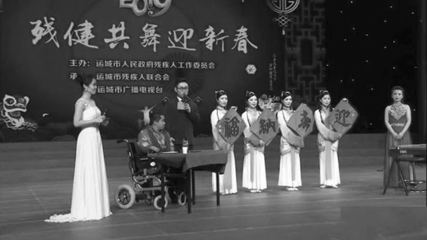 赠送棉衣活动的启动仪式上,市政府残工委主任、副市长陈竹琴,市残联党组书记、理事长刘红平为我县残疾人发放了棉衣,小小棉衣是各级领导对残疾人的关爱,让残疾人在这个冬天更温暖。在残健共舞迎新春文艺汇演中,市残联残疾人工作者魏倩楠和我县残疾人口书画家万二春合作的书法与古筝<渔舟唱晚>节目,得到了一致好评。短短的几分钟,万二春用口持笔写下了迎春纳福四个大字,赢得了现场热烈的掌声。