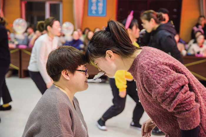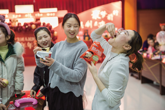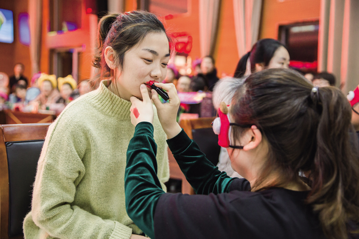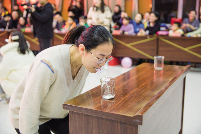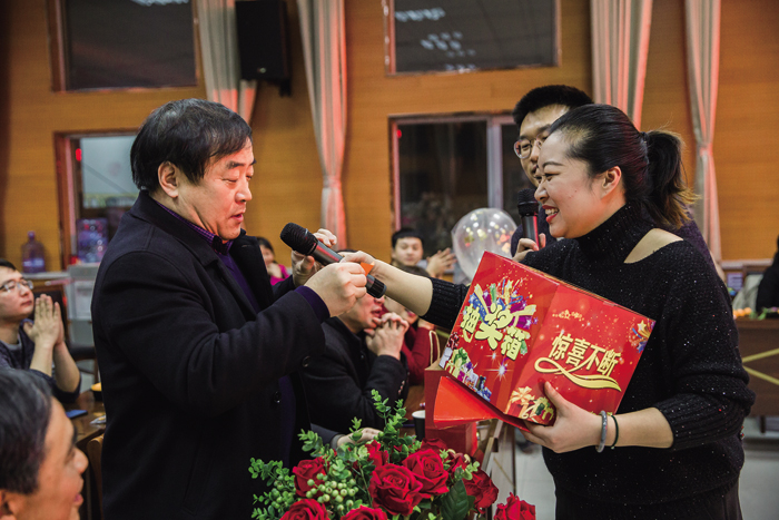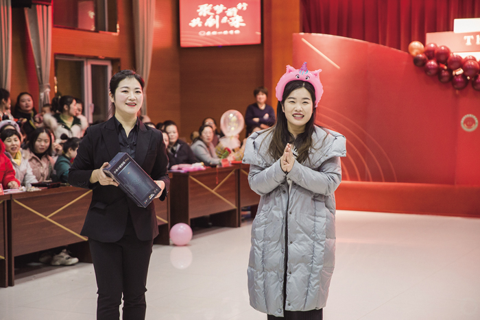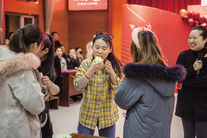 当宣布年会活动开始时,全场欢声笑语,各种活动有序进行,节目新颖多样,歌曲串烧、秧歌舞、歌伴舞、跺跺脚,踩气球、扑克牌传面粉、恐惧箱等形式多样的活动让观众耳目一新。