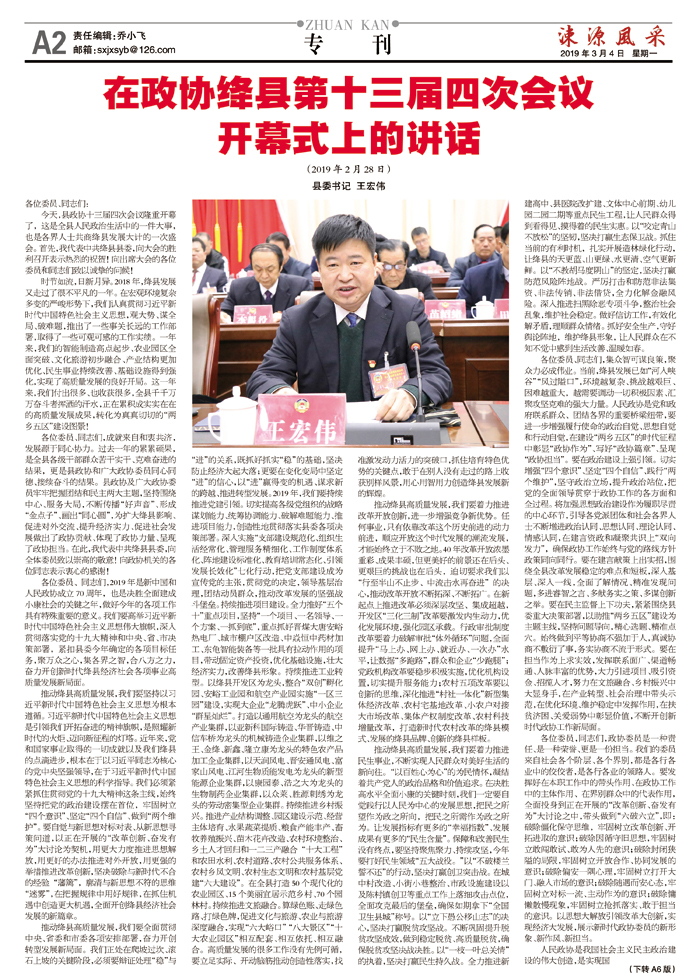 县委书记 王宏伟(2019年2月28日)在政协绛县第十三届四次会议开幕式上的讲话