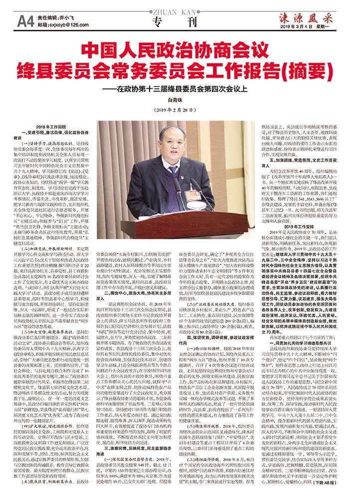 白海珠(2019年2月28日)中国人民政治协商会议绛县委员会常务委员会工作报告(摘要)——在政协第十三届绛县委员会第四次会议上
