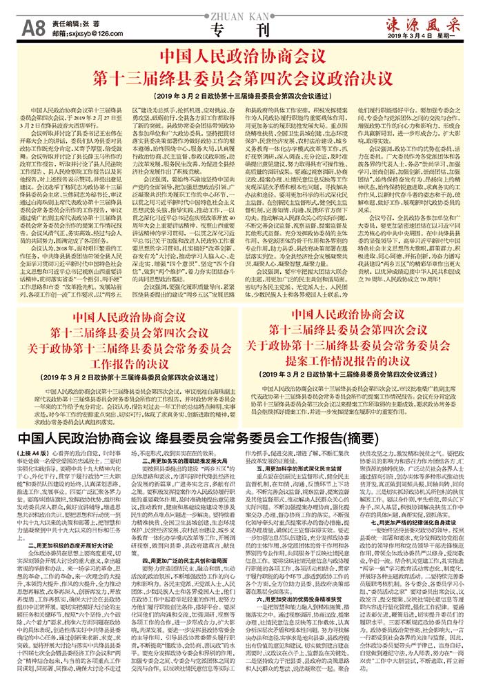 (2019年3月2日政协第十三届绛县委员会第四次会议通过)中国人民政治协商会议第十三届绛县委员会第四次会议政治决议