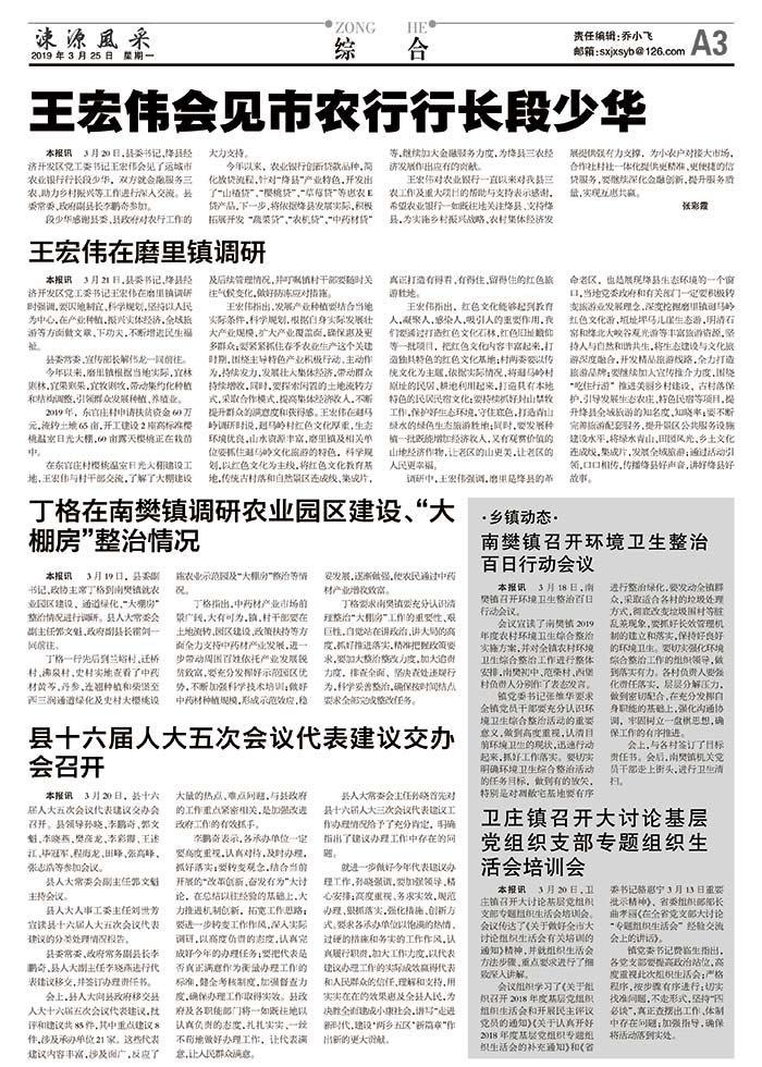 本报讯 3月19日,县委副书记、政协主席丁格到南樊镇就农业园区建设、通道绿化、“大棚房”整治情况进行调研。县人大常委会副主任郭文魁、政府副县长霍剑一同前往。