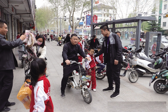 4月10日中午13时10分,正值学生上学高峰期,只见实验一校和县直初中学校门口道路两侧齐刷刷的站着两排人,并佩戴印有“爱心护学岗”字样的胸牌。现场可以看到学校门口道路两侧地面每隔一段距离就印有“护学岗”字样,每个护学岗字样上站着一位由学生家长自愿组建的爱心护卫成员。据了解,他(她)们每天早、中、晚上、放学高峰期都会站在学校门口护送孩子们安全入校,提醒接送孩子家长时刻注意安全,帮助孩子快速上下车,并由县交警大队城镇中队民警协助和指导,引导接送孩子家长车辆有序停放,提醒接送孩子车辆及过往车辆不得随意掉头、不乱变更车道等,交警、家长、学校三方合力共同维护学生上、放学高峰时段学校门口及周边道路交通畅通、有序。