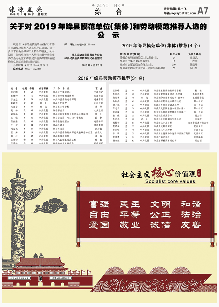 关于对2019年绛县模范单位(集体)和劳动模范推荐人选的公 示