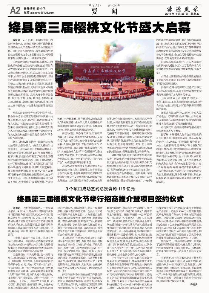 本报讯 4月25日,为期五天的山西省鲜活农产品“走出山西网上行”暨绛县第三届樱桃文化节在陈村镇农民公园隆重开幕。来自全国各地的专家、各界嘉宾和当地百姓齐聚樱桃之乡,齐品樱桃甘甜,领略樱桃丰韵,共商发展大计,共谋未来之路。