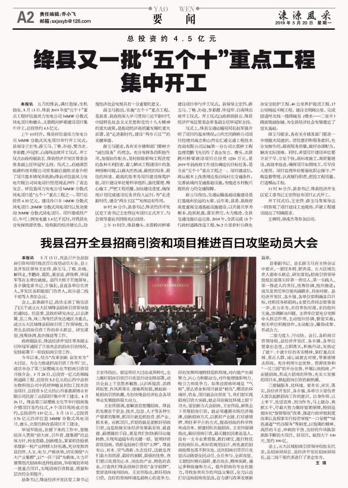 今年以来,结合“改革创新 奋发有为”大讨论,为全力推进招商引资工作开门红,成功举办了第三届樱桃文化节招商引资项目推介会。3月28日,总投资一亿元的厢城街道路工程、总投资5.2亿元的山西中焱恒生物科技公司中药材种植及初加工技术改造项目、总投资5亿元的山西泰鑫源铸业有限公司民营工业园项目集中开工建设。4月26日,绛县第三届樱桃文化节举行招商推介暨项目签约仪式,9个项目现场成功签约,总投资约119亿元。5月13日,总投资3.76亿元的祥信盈54MW分散式风电项目,磨头、北册危桥改造项目开工建设。