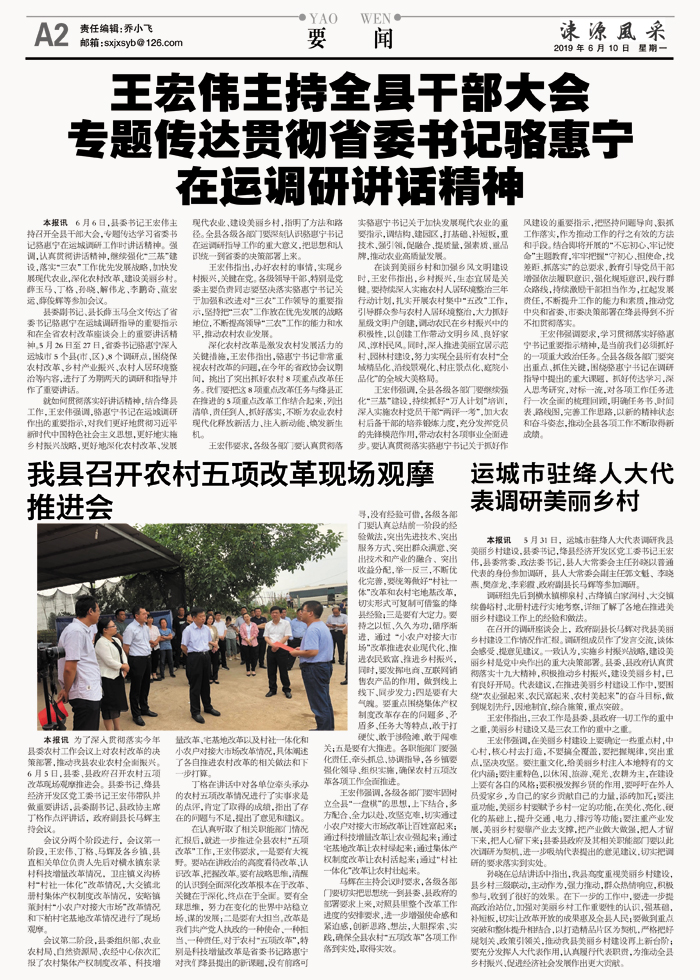 县委副书记、县长薛玉马全文传达了省委书记骆惠宁在运城调研指导的重要指示和在全省农村改革座谈会上的重要讲话精神。5月26日至27日,省委书记骆惠宁深入运城市5个县(市、区)、8个调研点,围绕保农村改革、乡村产业振兴、农村人居环境整治等内容,进行了为期两天的调研和指导并作了重要讲话。