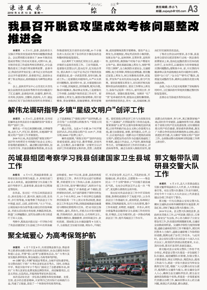 考察中,程海龙向张应征一行详细介绍了我县创建国家卫生县城工作中的具体做法和感受。2017年以来,县委、县政府高度重视创卫工作,多次召开会议进行安排部署,并将爱国卫生工作纳入县委、县政府年度工作目标,坚持“横向到边”,按照分片包干的原则,确定了17条街道、87个路段,坚持领导亲自抓,实行县四套班子领导分街包片、11个牵头单位、106个责任单位包路段责任制及周一下午上街义务劳动制度,推进创卫工作常态化开展;围绕县城基础设施建设与精细化管理两大任务,把52项创卫指标细化、量化、具体化,并重点从市容市貌管理、传染病防治、食品安全、公共场所卫生、病媒生物防治、健康教育、农村环境卫生、农村改厕、国家级卫生乡镇创建等9方面入手,全面推进卫生城市创建。现如今,不闯红灯、牢系安全带、礼让行人、不乱扔垃圾、不随地吐痰、孝老爱亲、志愿服务………绛县民众一个个文明“微举止”不但提升着县城的气质,也充分证明创卫不止是一次“考试”,更是群众素质的全面升级。