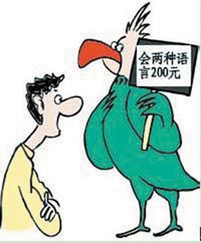 另一只鹦鹉前则标道:此鹦鹉会四门语言,售价四百元。