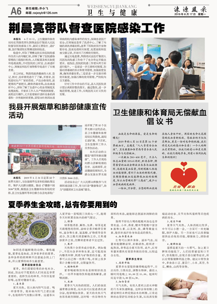 本报讯 6月11日,卫生健康和体育局局长荆晨亮带队到绛县医疗集团人民医院督导医院感染工作,副局长贾俊红、逯矿旗、医疗集团院长樊柳龙陪同检查。