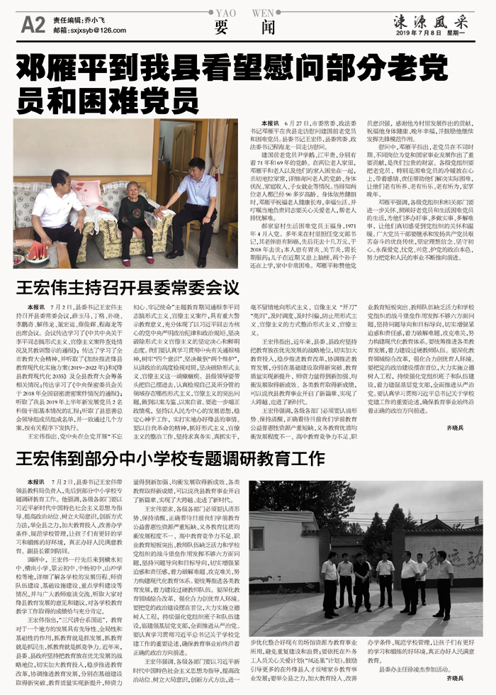 本报讯 7月2日,县委书记王宏伟主持召开县委常委会议,薛玉马、丁格、孙晓、李鹏奇、解伟龙、董宏运、薛俊辉、程海龙等出席会议。会议传达学习了《中共中央关于李平同志搞形式主义、官僚主义案件查处情况及其教训警示的通报》;传达了学习了全市教育大会精神,并听取了《加快推进绛县教育现代化实施方案(2019-2022年)》和《绛县教育现代化2035》及全县教育大会筹备相关情况;传达学习了《中央保密委员会关于2018年全国窃密泄密案件情况的通报》;听取了我县2019年上半年新发展党员2名科级干部基本情况的汇报;听取了县慈善总会领导组成员组成名单,并一致通过几个方案,按有关程序下发执行。