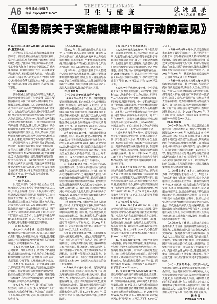 《国务院关于实施健康中国行动的意见》