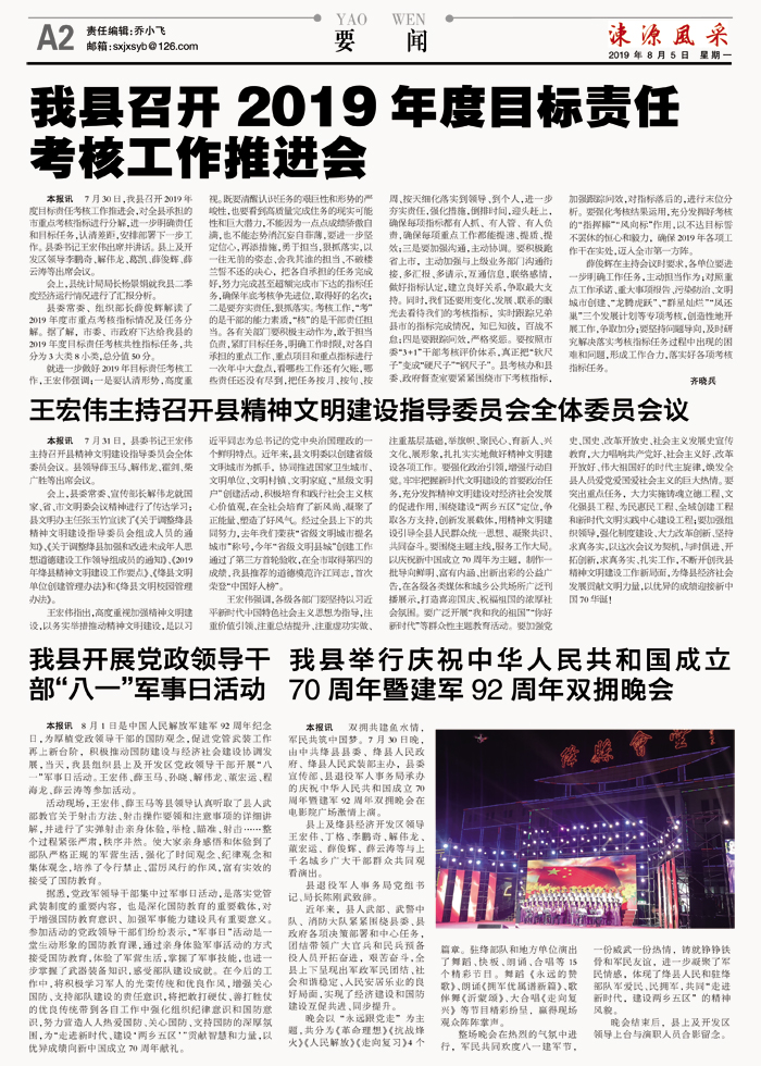 王宏伟强调,各级各部门要坚持以习近平新时代中国特色社会主义思想为指导,注重价值引领、注重总结提升、注重虚功实做、注重基层基础,举旗帜、聚民心、育新人、兴文化、展形象,扎扎实实地做好精神文明建设各项工作。要强化政治引领,增强行动自觉。牢牢把握新时代文明建设的首要政治任务,充分发挥精神文明建设对经济社会发展的促进作用,围绕建设“两乡五区”定位,争取各方支持,创新发展载体,用精神文明建设引导全县人民群众统一思想、凝聚共识、共同奋斗。要围绕主题主线,服务工作大局。以庆祝新中国成立70周年为主题,制作一批导向鲜明、富有内涵、出新出彩的公益广告,在各级各类媒体和城乡公共场所广泛刊播展示,打造喜迎国庆、祝福祖国的浓厚社会氛围。要广泛开展“我和我的祖国”“你好新时代”等群众性主题教育活动。要加强党史、国史、改革开放史、社会主义发展史宣传教育,大力唱响共产党好、社会主义好、改革开放好、伟大祖国好的时代主旋律,焕发全县人员爱党爱国爱社会主义的巨大热情。要突出重点任务,大力实施铸魂立德工程、文化强县工程、为民惠民工程、全域创建工程和新时代文明实践中心建设工程;要加强组织领导,强化制度建设、大力改革创新、坚持求真务实,以这次会议为契机,与时俱进、开拓创新,求真务实、扎实工作,不断开创我县精神文明建设工作新局面,为绛县经济社会发展贡献文明力量,以优异的成绩迎接新中国70华诞!